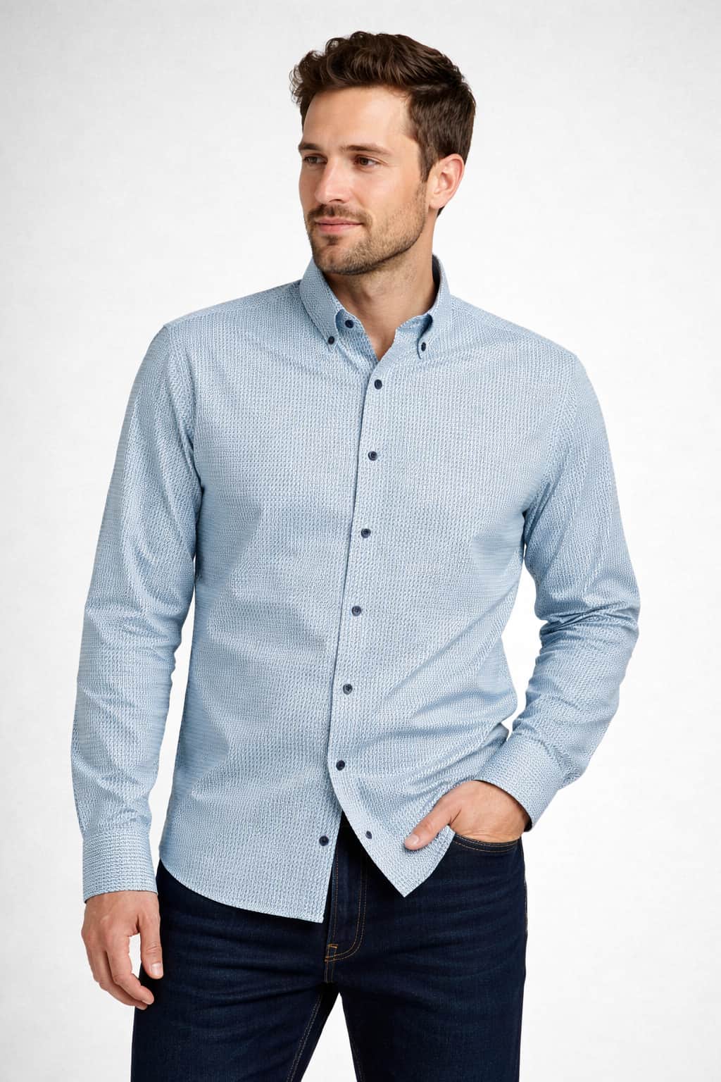 A classic button down collar adds a refined, versatile touch, allowing the shirt to transition seamlessly from smart-casual office wear to relaxed evening styling. Finished in a timeless blue printed design, this Casa Moda shirt pairs effortlessly with jeans, chinos, or tailored trousers. The addition of a practical front chest pocket completes the look while maintaining a clean, modern aesthetic.