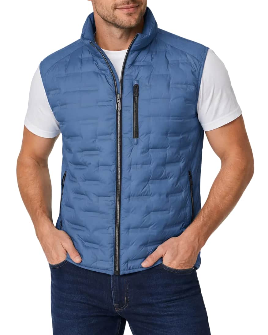 The quilted front and back panels provide lightweight insulation, while the textured side panels enhance flexibility and airflow for all-day comfort. A stand collar adds protection against the elements, and the full zip fastening allows for easy layering over shirts, polos or knitwear.