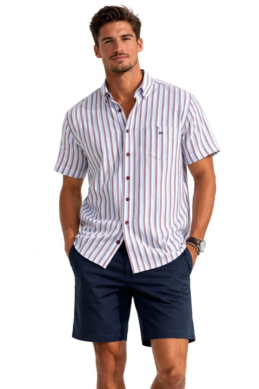 A versatile men’s short sleeve striped shirt designed for effortless summer styling and smart-casual dressing.
