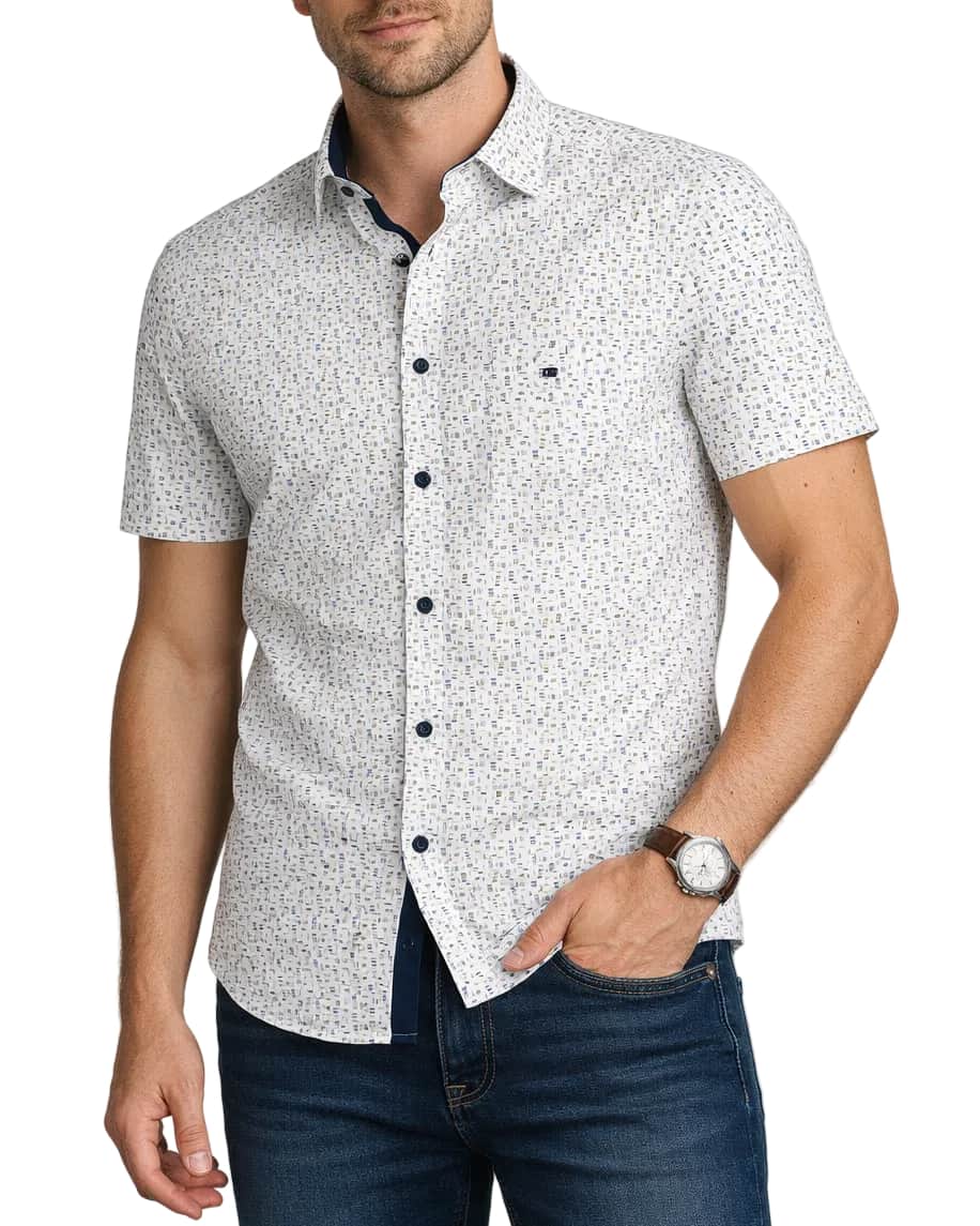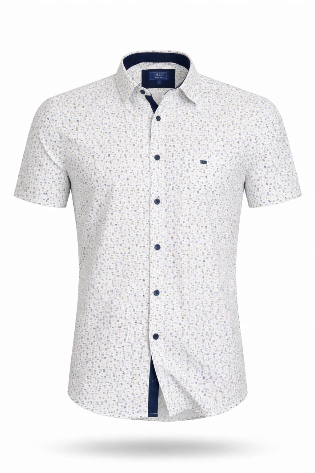 Finished in a clean blue and white colour palette, the abstract pattern design adds a modern edge while remaining easy to style with jeans, chinos, or tailored shorts. The regular fit and classic short sleeve silhouette deliver a relaxed yet polished look that works perfectly for casual days, weekends, and smart-casual occasions.