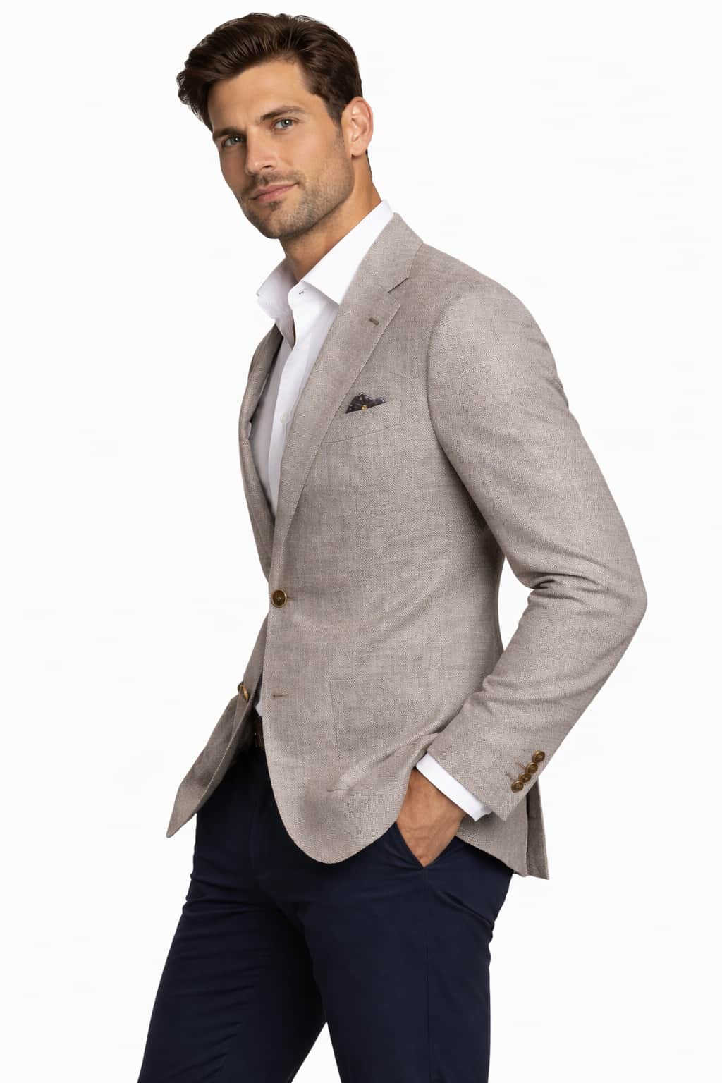 Crafted from a premium linen blend fabric, the Soho combines 51% polyester, 31% linen and 16% wool to create a breathable yet structured finish. The linen content provides natural texture and seasonal lightness, while wool adds softness and depth. Polyester enhances durability and crease resistance, ensuring the jacket maintains its shape throughout the day.