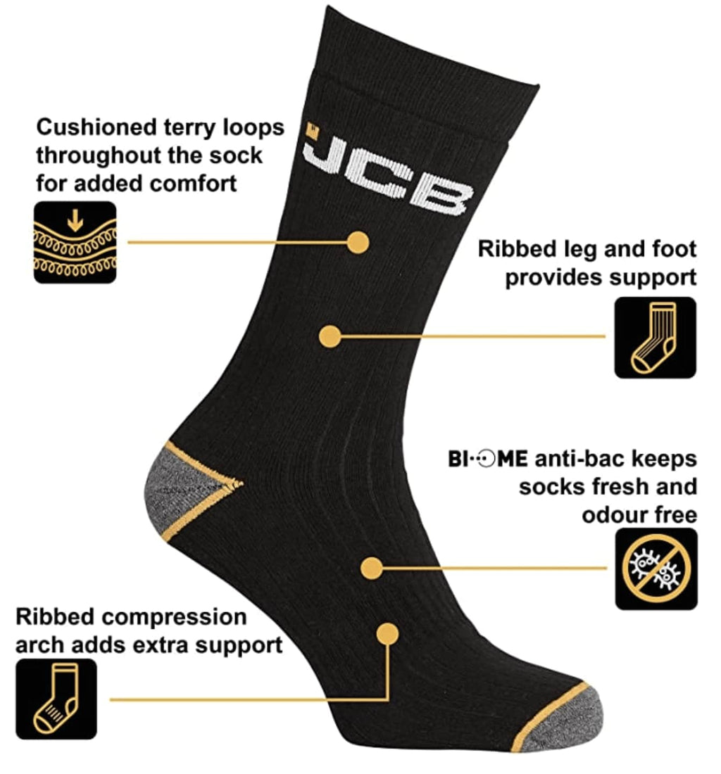 Experience Enhanced Support in Men's Socks: JCB stands as the leading work boot sock brand in the UK. These JCB Socks prioritize both comfort and protection. Packaged in sets of three, these black men's socks feature a distinct JCB logo and yellow highlights on the heel, offering thickness that's perfect for outdoor pursuits like work, hiking, and leisurely strolls.