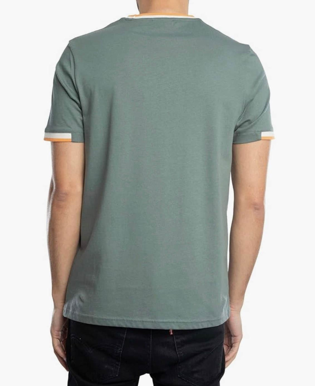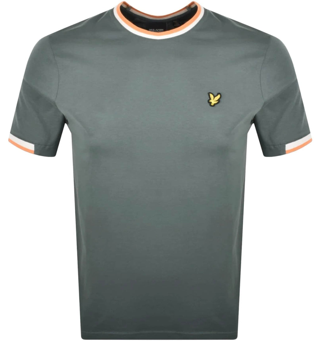 Lyle And Scott Half Tipped T Shirt In green. A cotton jersey t shirt with a ribbed crew neckline and ribbed cuffs on the short sleeves, both of which feature a tipped design in dark pruple and off white. The signature Lyle And Scott Golden Eagle logo badge is embroidered on the left of the chest in black and yellow.