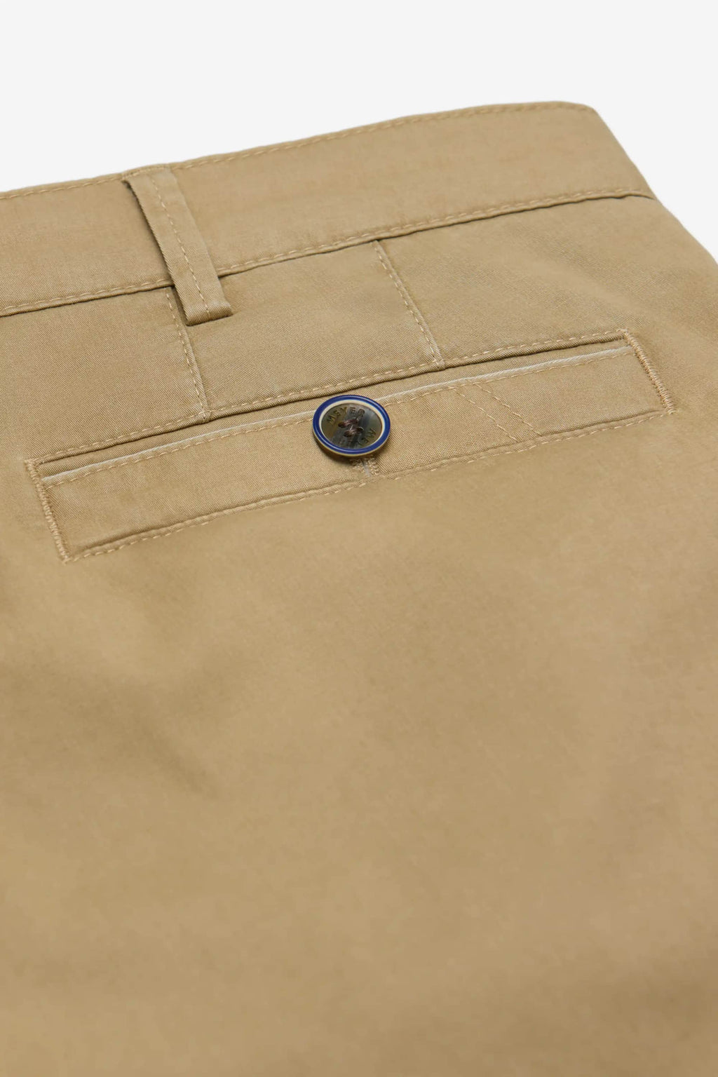 Buttoned, piped back pockets with decorative stitching