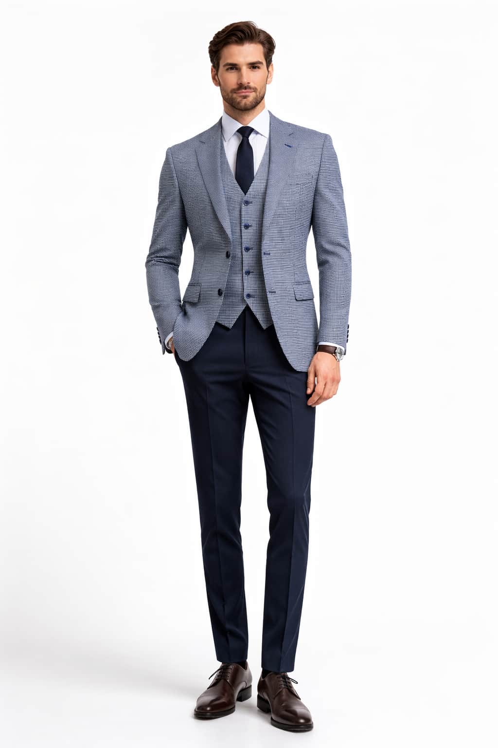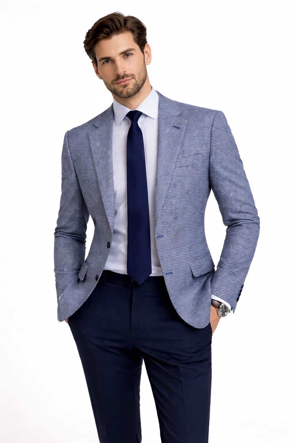 Crafted in a refined blue tone with a subtle houndstooth pattern, the Jasper jacket offers depth and texture without overpowering your overall look. The classic tailoring details make it ideal for weddings, race days, business events or smart evening occasions, while the modern cut keeps it current and stylish.